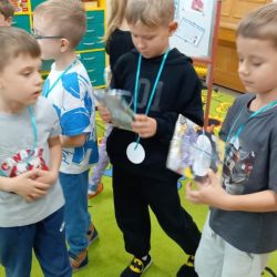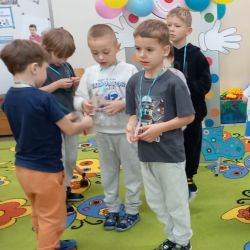 Następnie dzieci uczestniczyły w wesołych zabawach ruchowych, które dostarczyły im wiele radości i uśmiechu. Dziewczynki przygotowały dla swoich kolegów niespodzianki – każdy chłopiec otrzymał upominek oraz medal „Super Chłopaka”.