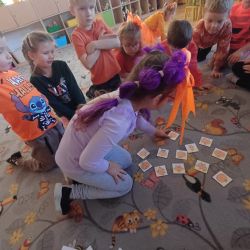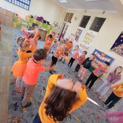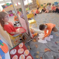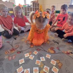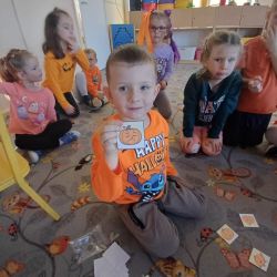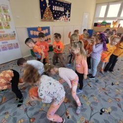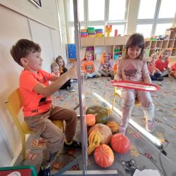 Rozpoczęliśmy od dyniowej gimnastyki, podczas której dzieci ćwiczyły z uśmiechem, rozciągając się i skacząc razem z dyniowymi towarzyszami!