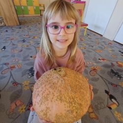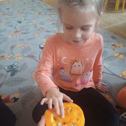 Nie zabrakło też poznawania dyni z bliska – przedszkolaki oglądały ją z zewnątrz i od środka, odkrywając jej tajemnice.
