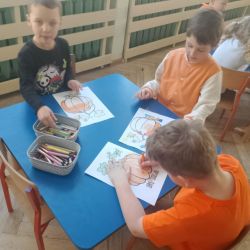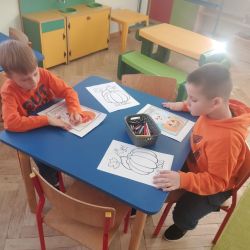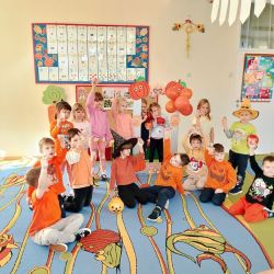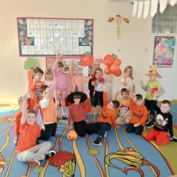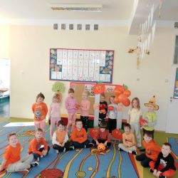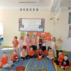 31 października grupa "Tygryski" obchodziła Święto Dyni. Dzieci przyszły ubrane na pomarańczowo, dzięki czemu w sali zrobiło się bardzo wesoło i kolorowo. Tymon przyniósł dla wszystkich słodką niespodziankę - cukierki, którymi poczęstował kolegów i koleżanki. Dzieci kolorowały kolorowanki z motywem dyni. To był bardzo radosny i pełen jesiennych barw dzień.