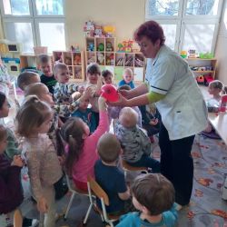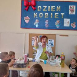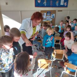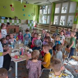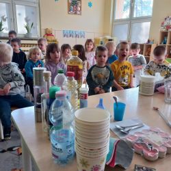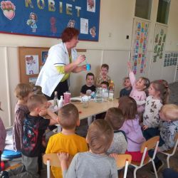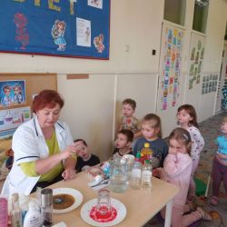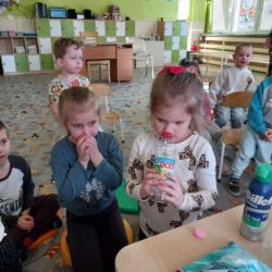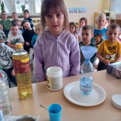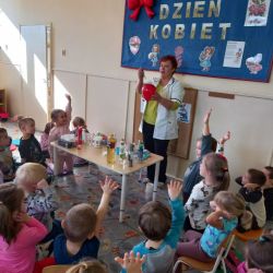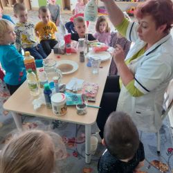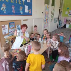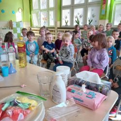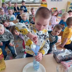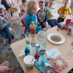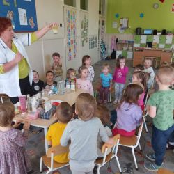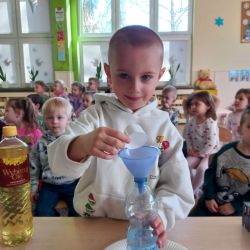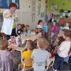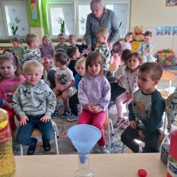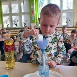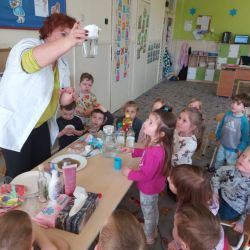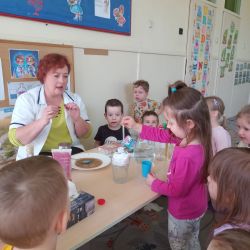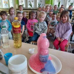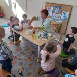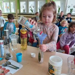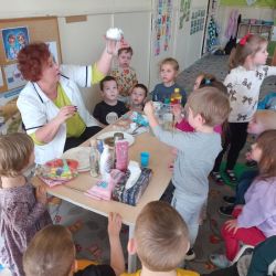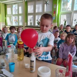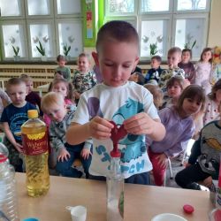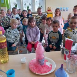 Przedszkolaki z grupy Żabki i Misie razem uczestniczyły w niecodziennych zajęciach, podczas których pani Ania wcieliła się w rolę szalonego naukowca. Dzieci z zachwytem w oczach przypatrywały się erupcji wulkanu, nadmuchały balon bez pomocy pomki, dowiedziały sie, że balon można przebić szpilką, a on nie pęknie. Emocje wzbudzały również doświadczenia z wodą i olejem, które nie chciały się pomieszać czy że świeczką, która spowodowała, że talerz z wodą stał się suchy, bo wszystko wyssała szklanka. Czyżby to czary? Przedszkolaki już wiedzą, że to żadna magia, a nauka, która może być ciekawa, kolorowa i zaskakująca.