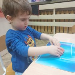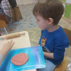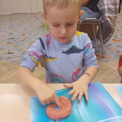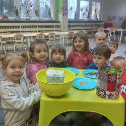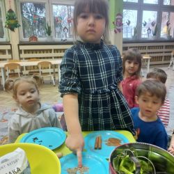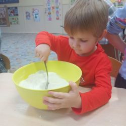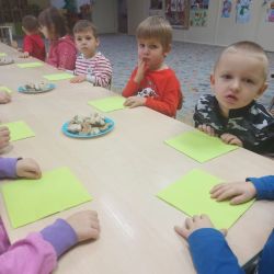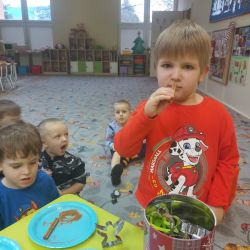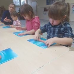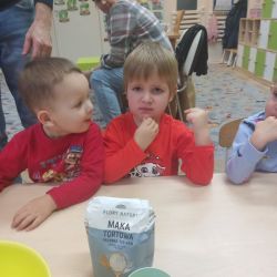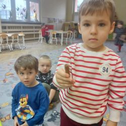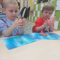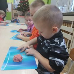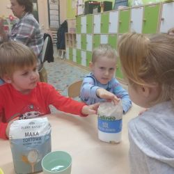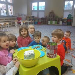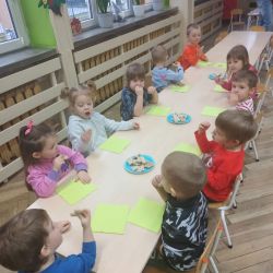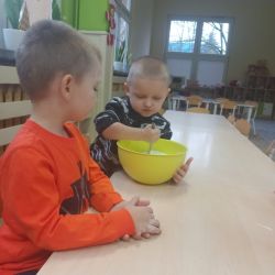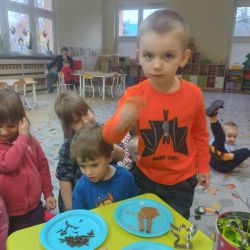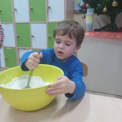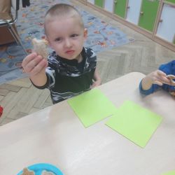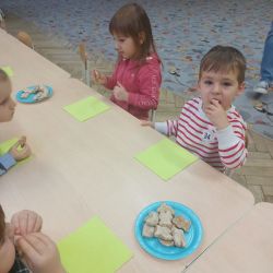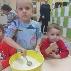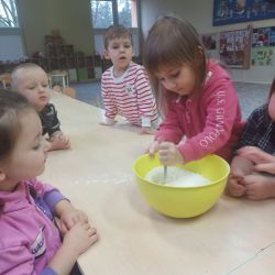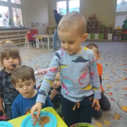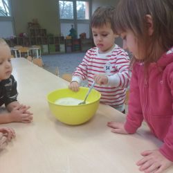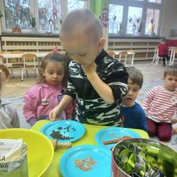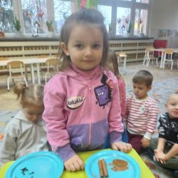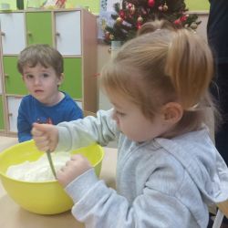 Żabki z ogromną ciekawością i ochotą zgłębiały temat pieczenia pierniczków. Ten przyjemny zwyczaj znany i kultywowany jest od dawna, a smak korzennych ciasteczek wprowadza wszystkich w prawdziwie świąteczny nastrój. Żabki poznały więc takie przyprawy jak cynamon, goździki czy kardamon i nauczyły się je rozróżniać po zapachu. Wprawdzie nie mieliśmy prawdziwego piernikowego ciasta, ale masa solna wybornie je zastępowała i wycinanie ciastek w przeróżnych kształtach dostarczyło dzieciom satysfakcji i dobrej zabawy. To było też świetne ćwiczenie sensoryczne. Gdy już wszystkie nibypierniczki oczekiwały na wyschnięcie, przedszkolaki degustowały prawdziwe ciastka i przyznały, że takie zajęcia mogłyby się odbywać częściej.