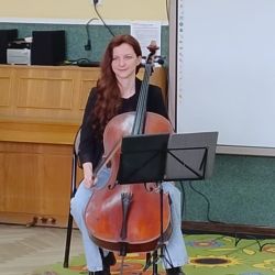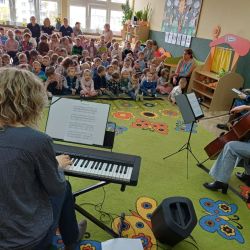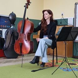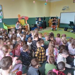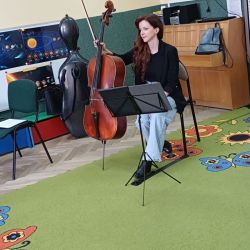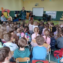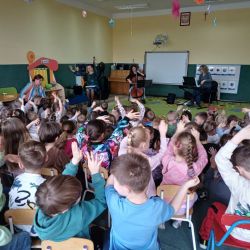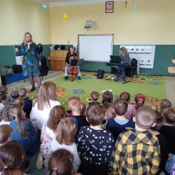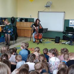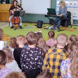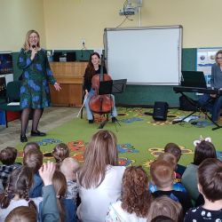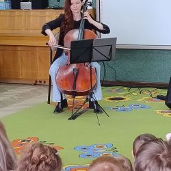 W poniedziałek - 13 kwietnia - gościliśmy muzyków z Filharmonii Świętokrzyskiej z koncertem kameralnym "Baśnie dźwiękiem pisane". Dzieci przeniosły się w magiczny świat baśni o Kopciuszku, ilustrowany piękną muzyką. Niezwykłe melodie pełne emocji oraz dźwięki wiolonczeli i fortepianu rozbudziły wyobraźnię najmłodszych i pozwoliły im przeżyć muzyczną przygodę.