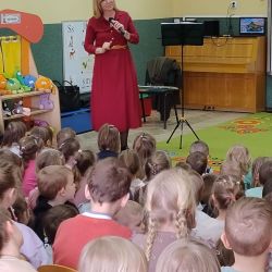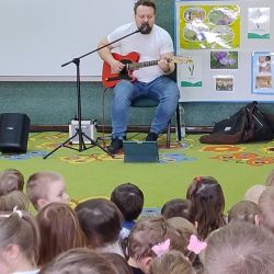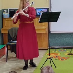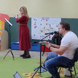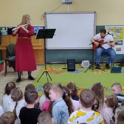 Dzieci poznały też wygląd, budowę i brzmienie gitary akustycznej i fletu poprzecznego. Spotkaniu z piękną muzyką towarzyszyły wspólny śpiew i wspaniała zabawa.