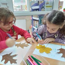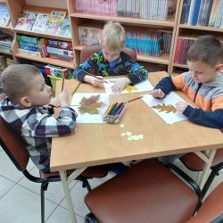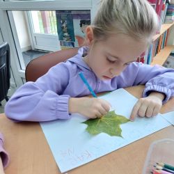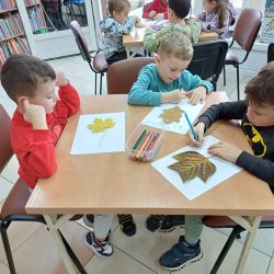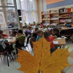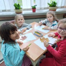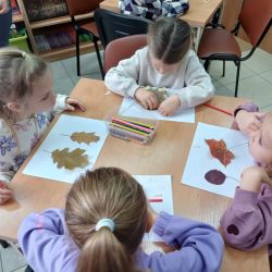 Po części literackiej przyszedł czas na twórcze działanie - przedszkolaki wykonały piękne prace plastyczne z wykorzystaniem zasuszonych liści. Zadanie wymagało od nich nie tylko precyzji, ale i kreatywności - przedszkolaki musiały wymyślić i dorysować tło, które najlepiej pasowało do ich "liściowego bohatera".