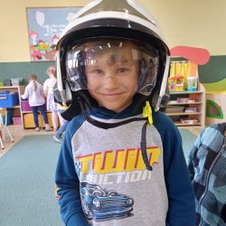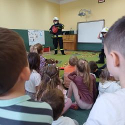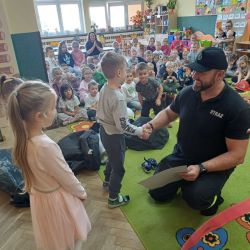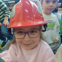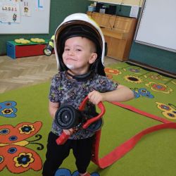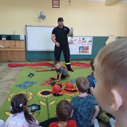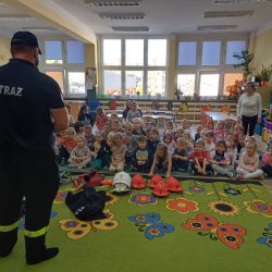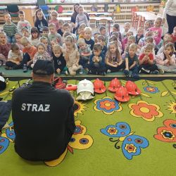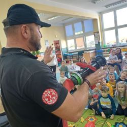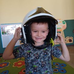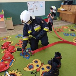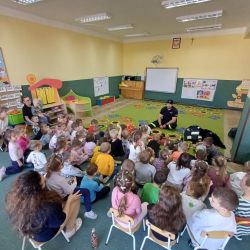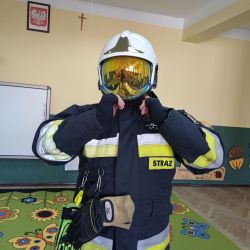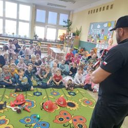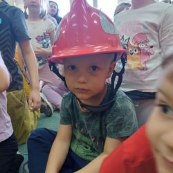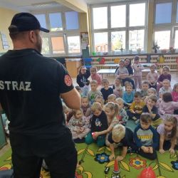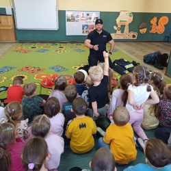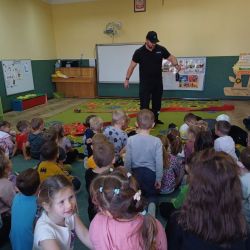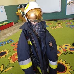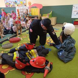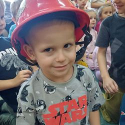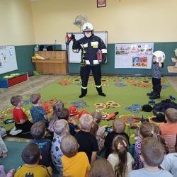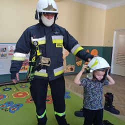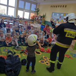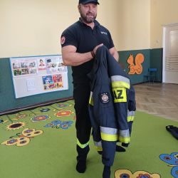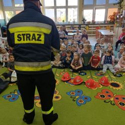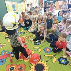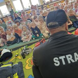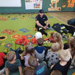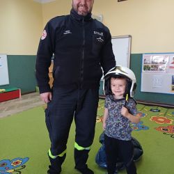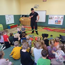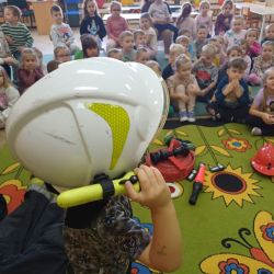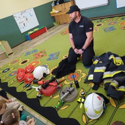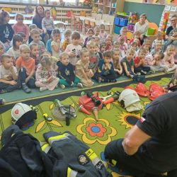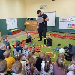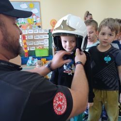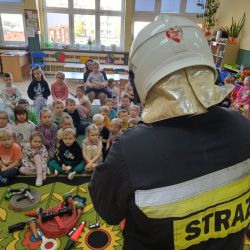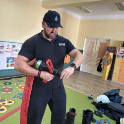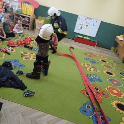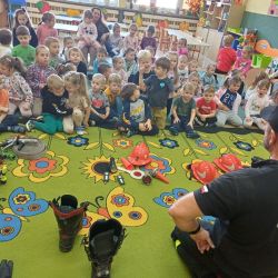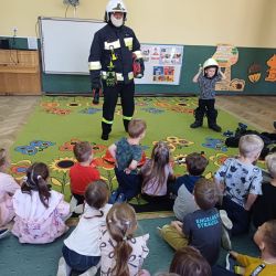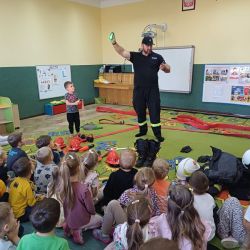 W czwartek - 23 października 2025 r., grupy: MISIE, PSZCZÓŁKI i MOTYLKI odwiedził tata jednego z naszych przedszkolaków, który na co dzień pracuje jako strażak! Opowiedział dzieciom o swojej odpowiedzialnej i odważnej pracy, pokazał strażacki mundur, hełm oraz różne akcesoria, których używa w czasie akcji ratunkowych.