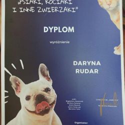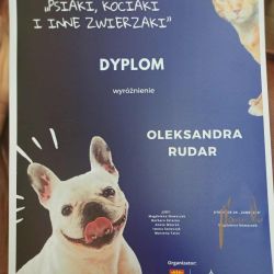 Z radością donosimy o sukcesie sióstr: Daryny i Oleksandry Rudar z grupy "Motylki', które zdobywając WYRÓŻNIENIE znalazły się w gronie LAUREATÓW VI Ogólnopolskiego Konkursu Plastycznego "PSIAKI, KOCIAKI I INNE ZWIERZAKI", zorganizowanego w ramach Światowego Tygodnia Zwierząt przez Dom Kultury "Zameczek" w Kielcach.